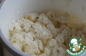 В готовый творог ( его получилось грамм 400 примерно) добавить на кончике ножа лимонную кислоту и на кончике ножа соль, влить сырые яйца.