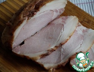 Нарезаем ветчину (у меня домашняя) на меленькие кубики размером со спичечную головку, добавляем ко второй части, перемешиваем.