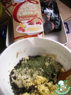 Стакан пшенных хлопьев «Мистраль» залить кипятком на пару минут. Лишнюю воду слить, остудить и добавить в фарш. Туда же добавить тертый сыр, вареную чечевицу белугу от «Мистраль».