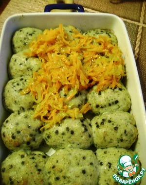 Биточки вынуть из духовки, покрыть луково-морковной смесью.