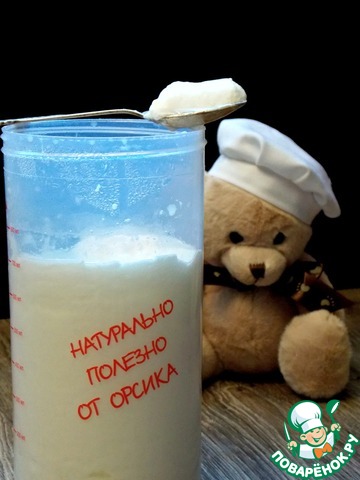 Начну с того, что я очень давно хотела попробовать мацони, но в наших магазинах её днём с огнём не найти. Поэтому когда я получила закваски, то первое что я из них сделала это была она. Очень вкусный напиток получился, поэтому для этого блюда мне пришлось делать вторую порцию. Для этого я вскипятила один литр молока и остудила до комнатной t (22-24 ). Для приготовления мне понадобится йогуртница-термос от фирмы "Orsik ". Классная вещь я Вам скажу. Не очень большая в размере, выполнена полностью из прочного пластика. Так что биться, в отличие от простых, не чему. К нему прилагается пластиковый стакан на 1 л. с крышкой, с мерными делениями до литра, куда я залила молоко, добавила один пакетик с закваской и хорошенько перемешала до ее растворения. Закрыла плотно крышкой. В термос залила кипящую воду до нужной отметки и поставила в него стакан с молоком. Закрыла термос и укутала одеялом на 8 часов. Вообще положено просто поставить в теплое место, но у нас после отключения отопления с этим очень проблематично.