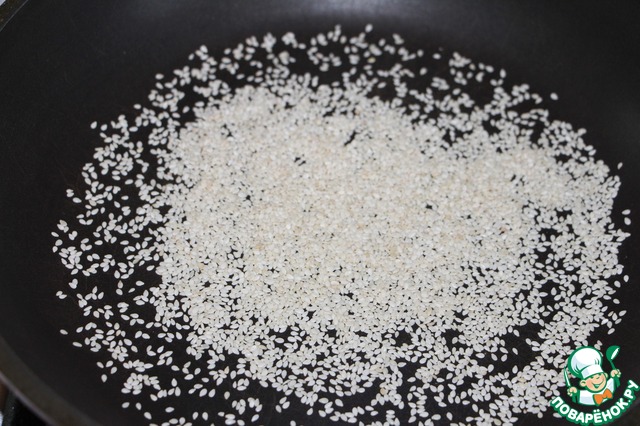 Семена кунжута обжарить на сухой сковороде 30-60 секунд.