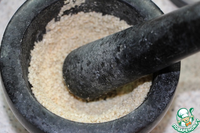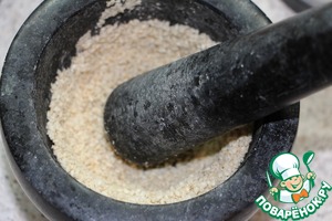 Пересыпать их в ступку и растереть пестиком с солью (аромат халвы витает по кухне)