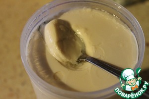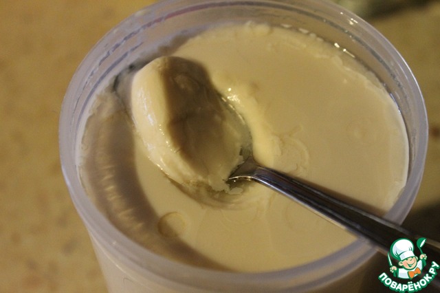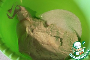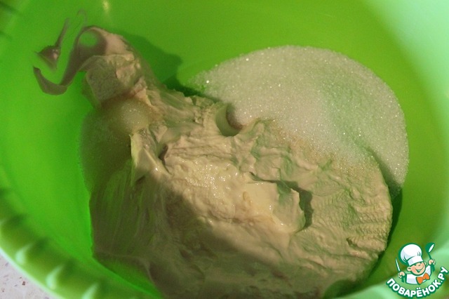 Ряженку освободить от марли и выложить в миску, добавить сахар, перемешать.