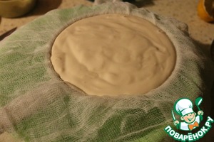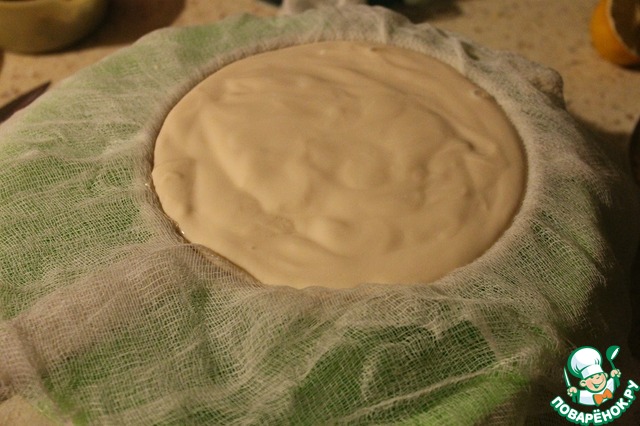 В глубокую миску поставить сито, сверху положить марлю сложенную в 4-5 слоев. Налить ряженку, завернуть края марли и убрать в холодильник на ночь.
