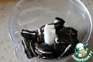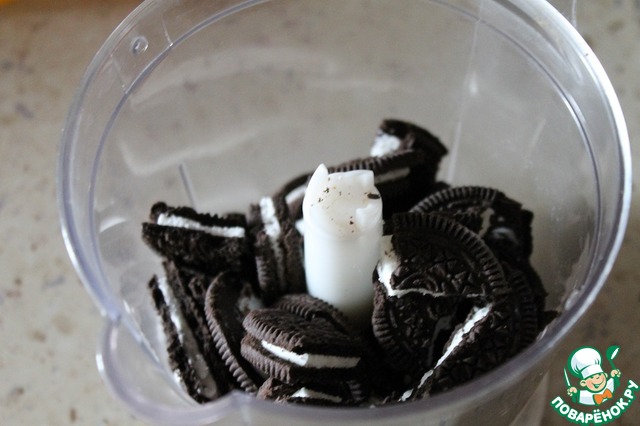 Печенье разломать на кусочки и измельчить с помощью блендера в мелкую крошку.
