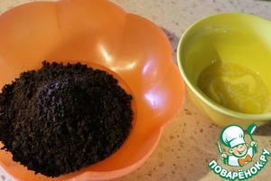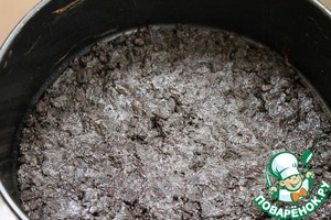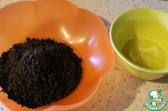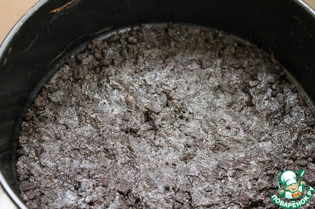 Дно разъемной формы (d - 18 см) застелить пергаментом и выложить крошку печенья с маслом. Разровнять руками. Поставить в заранее разогретую до 160 градусов духовку на 15 минут. Готовый корж остудить.