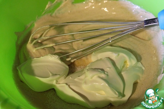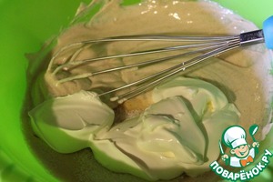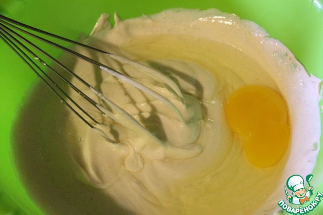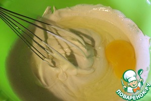 Яйца по одному, после каждого, массу тщательно перемешивать венчиком.