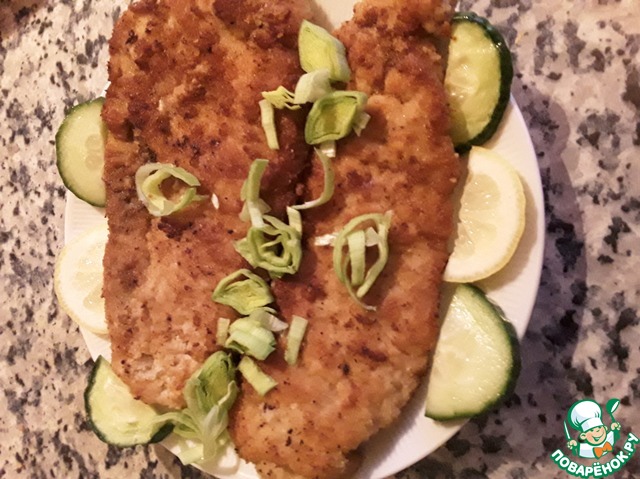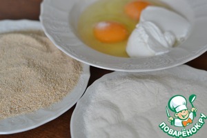 Отдельно мука, отдельно яйца, взбитые со сметаной и отдельно панировочные сухари. -