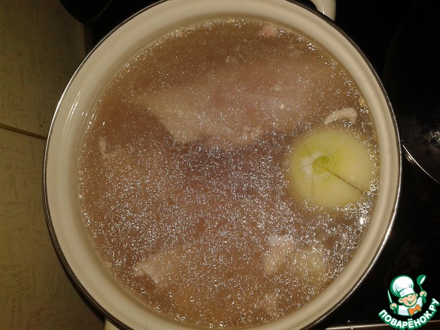 Ставим вариться наш бульон. В бульон я сразу добавляю соль, лук нарезанный, и перец горошком.