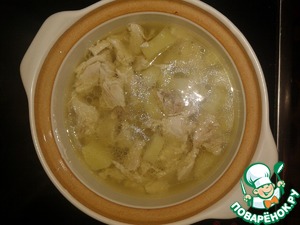 Через пол часа бульон процеживаем, убираем лук и перец, вынемаем грудку и ставим варить картофель. Картофель я режу небольшими кусочками, чтоб за раз можно было съесть.
