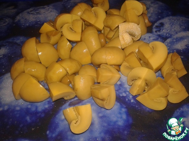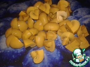 - Шампиньоны (Можно и свежие, и замороженные, маринованные) — 300-500 г