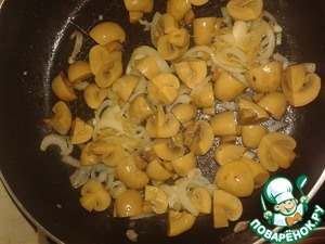 Через пару минут, когда лук становится слегка прозрачным, добавляем грибы. На сильном огне обжариваем их до золотистости.