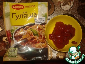 Сюда же добавляем приправу " Магги на второе для гуляша", соль и перец по вкусу, и чайную ложку сахара. -