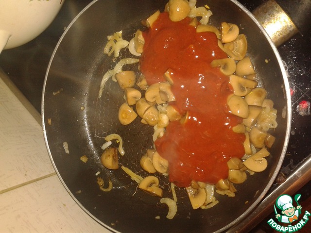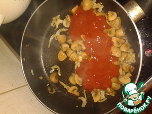 Заливаем соус в грибы, перемешиваем, немного обжариваем.