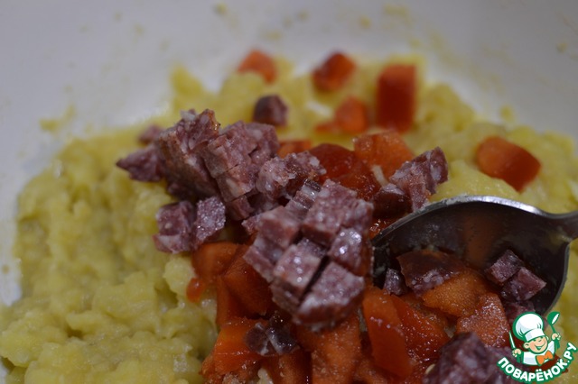 С перца снять шкурку, мелко порезать, порезать мелко копченое мясо или колбасу. Добавить колбасу и перец в картофель, посолить, добавить паприку, все как следует перемешать, добавить фасоль, еще раз перемешать.