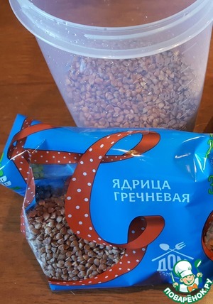 Почему гречка приготовилась так быстро? Всё просто я использую ядрицу гречневую от ТМ Мистраль. Крупу насыпаю в подходящую ёмкость объёмом 1 л, слегка промываю, заливаю фильтрованной водой и убираю в холодильник. Через пару часов гречка впитывает всю воду и остаётся свежей в течении нескольких суток. Если Вы планируете готовить через несколько часов оставьте ёмкость с замоченной гречкой просто на кухне.