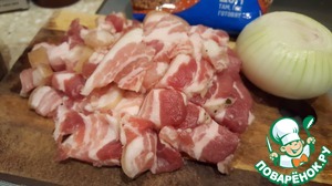 Нарезаем шпик из грудинки на желаемые ломтики. У меня грудинка с большим содержанием мяса. И ломтики достаточно крупные. -