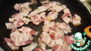 Нагреваем сковороду и выкладываем ломтики шпика. Слегка обжариваем.