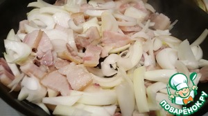 Нарезаем лук перьями и добавляем к шпику. Слегка обжариваем, постоянно помешивая.