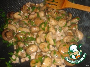 Добавьте мелко порезанную ветчину, измельченный чеснок, хлебные крошки (я не добавляла) и петрушку. Приправьте по вкусу. Жарьте без крышки на слабом огне 10 минут, часто помешивая.