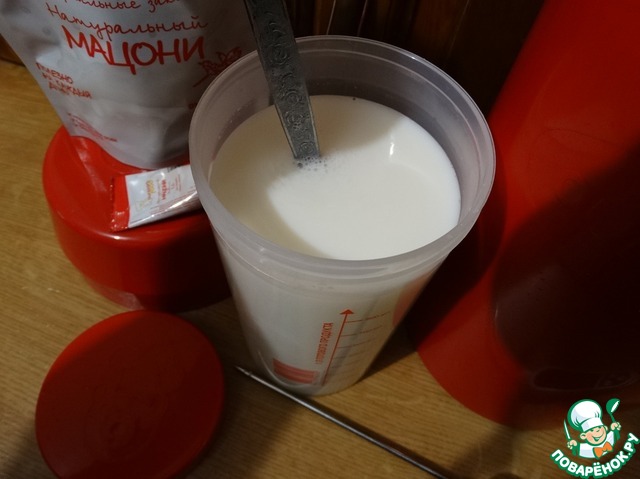 Для приготовления напитка мне нужно заранее получить мацони, это удобно сделать с помощью фирменного термоса, предоставленного спонсором и пакетика с закваской.