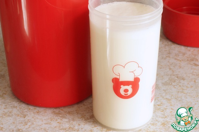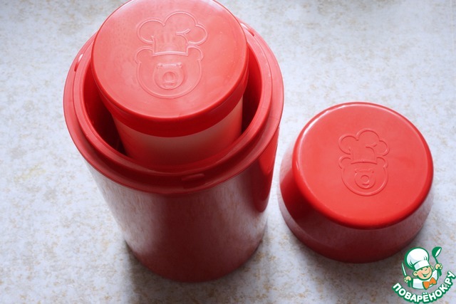 В термос наливаем горячую (100 градусов) воду, этот шаг меня насторожил, но решила не отступать от инструкции, так как пользовалась в первый раз таким чудом инженерной мысли. Поставить стакан с заготовкой в термос, закрыть его и оставить в теплом месте на 10 часов. У меня стоял просто на столе.