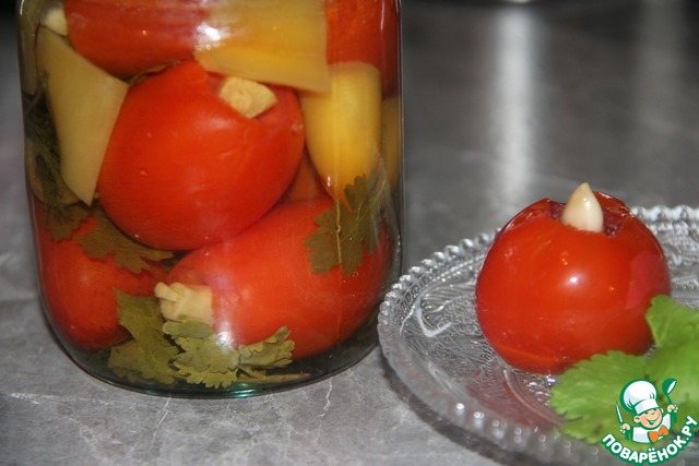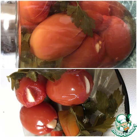У помидоров вырезать плодоножку и вставить по зубку чеснока (если у аас крупные зубки, разрежьте пополам вдоль).