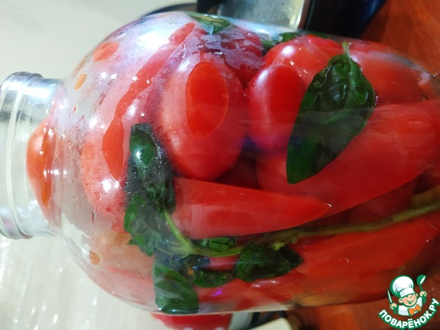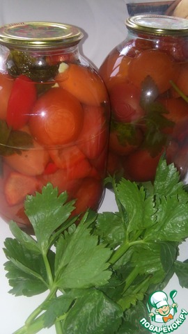 Укладываем помидоры в банку, прослаивая веточками сельдерея и петрушки, дольками болгарского перца + 1-2 см стручка острого перца - и заливаем кипятком на 20 минут.