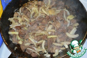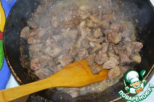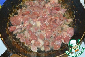 добавить к обжаренному мясу. Обжарить все вместе еще немного и