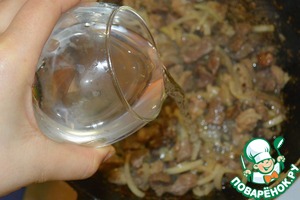 влить воду (у меня уходит стакан, но все зависит от ширины сковороды), чтобы покрыло мясо и тушить до полуготовности (примерно 15-20 минут).