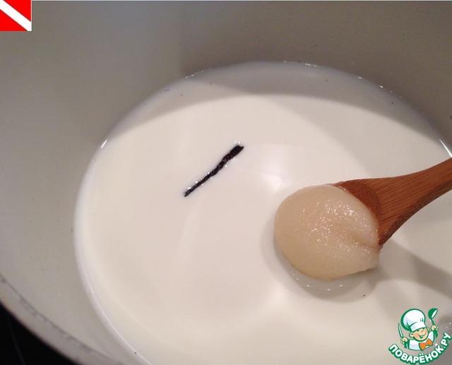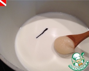 • Тем временем, в оставшееся молоко добавляем мед и содержимое части стручка ванили (да и сам стручок тоже - потом уберем) и нагреваем, но не даем закипеть. Затем остудить до комнатной температуры. Убрать ванильный стручок.