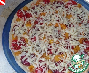 Из получившегося теста у меня выходит 2 пиццы размером 30 см в диаметре. Делю тесто на 2 части; руками, смазанными растительным маслом распределяю тесто по форме, выкладываю начинку.