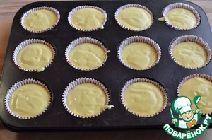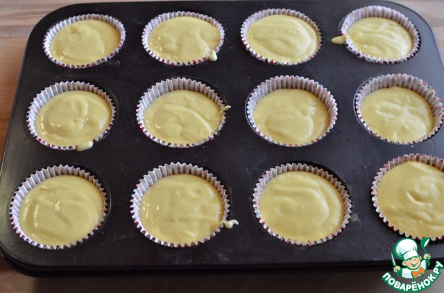 Разливаем тесто по формам, я разливала в бумажные капсулы, которые выложила в специальную форму для выпечки кексов. Выпекаем кексы в предварительно разогретой духовке до 180 градусов, 15-20 минут.