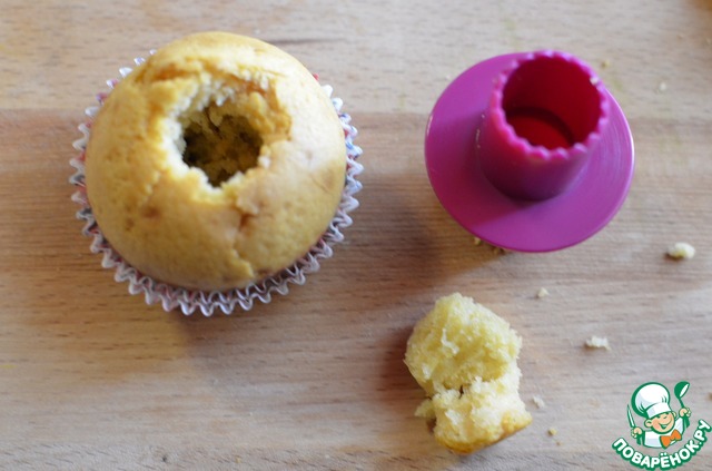 Готовые кексы остужаем, вынимаем из них серединку при помощи специального приспособления или кофейной ложечки.