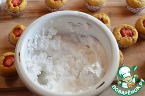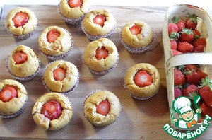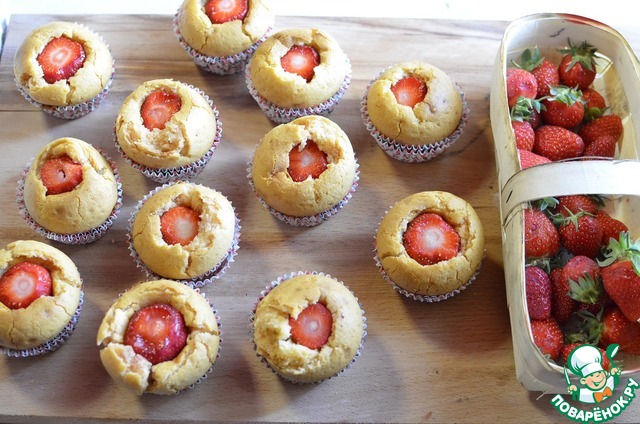 Клубнику вымыть. Отрезать хвостики. Обсушить, выложить клубнику в серединку кексов.