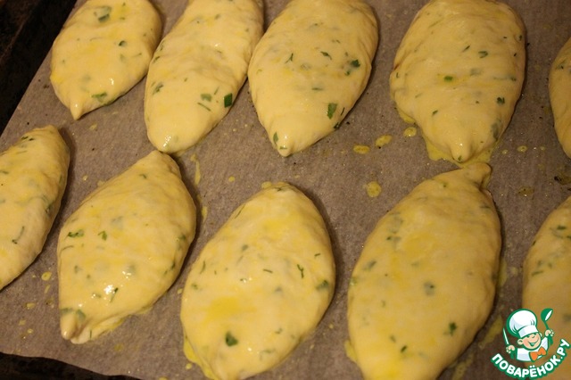 Каждую часть разровнять руками сформировав лепешку и положить начинку. Сложить на противень швом вниз, сверху смазать яйцом. Выпекать при температуре 200 градусов 30-40 минут, до золотистого цвета. Приятного аппетита!