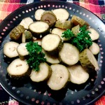 Нарезаем их кружочками толщиной примерно в 1 см. Если хотите чтоб они еще быстрее промариновались, режьте тоньше
