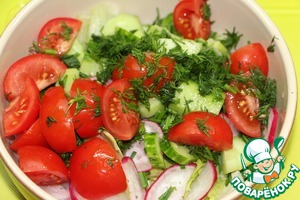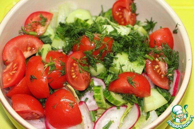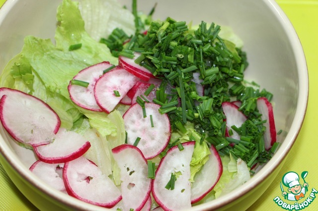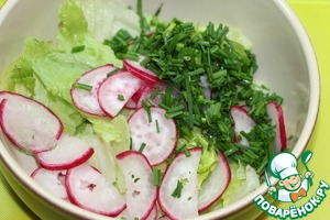 Листья салата порвать руками, зелень измельчить, редис порезать тонкими колечками