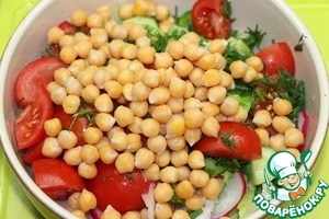 Добавить нут. Заправить салат оливковым маслом смешанным с лимонным соком, приправить крупной солью и свежесмолотым черным перцем. Перемешать.