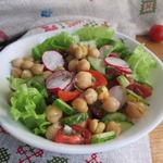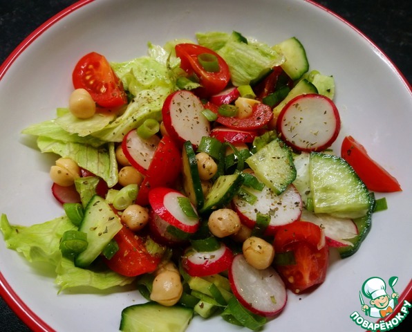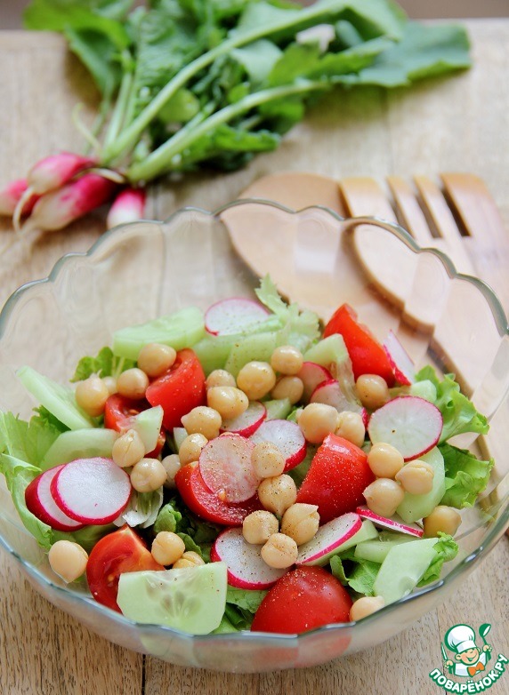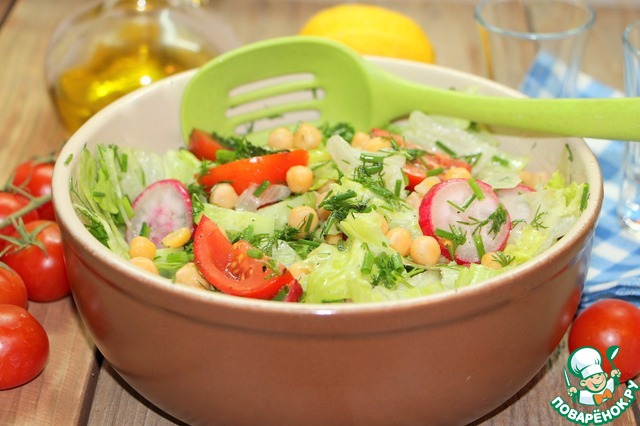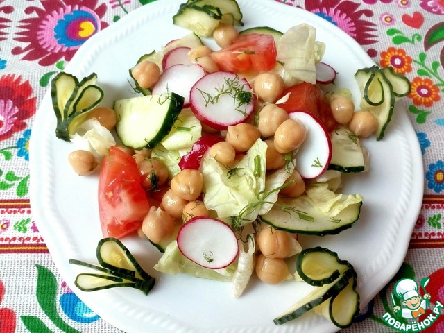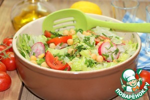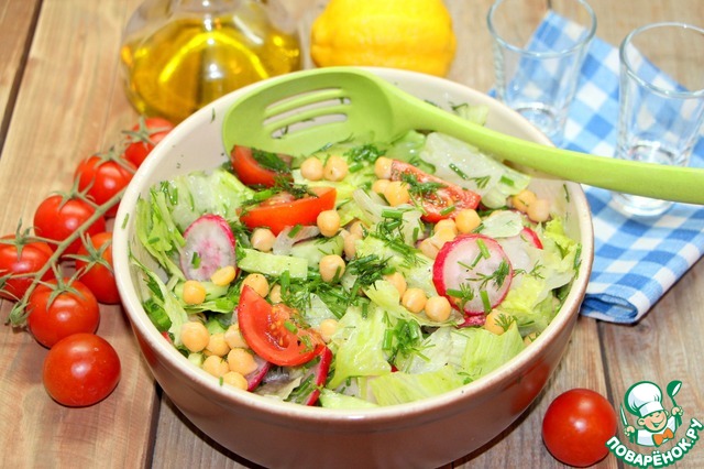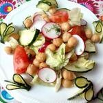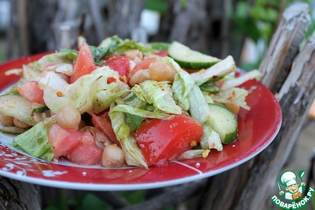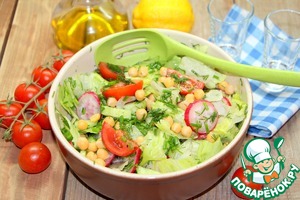 Сочный, свежий, не хлопотный, легкий, но в то же время сытный салат, который будет незаменим в жаркий летний день. Когда и готовить лень, а есть все же приходится. Вполне сбалансированный салат без мяса, но с белком, который заменяет нут. Как говорит мой супруг "Летний тазик на ужин", как то так и есть. Время приготовления указано без замачивания и варки нута.