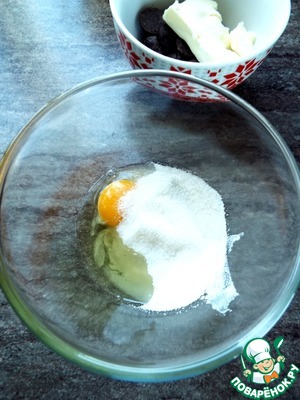 Приготовить печенье. Яйцо соединить с сахаром, а масло с шоколадом.
