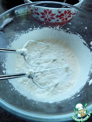 В яичную смесь высыпать муку и разрыхлитель.