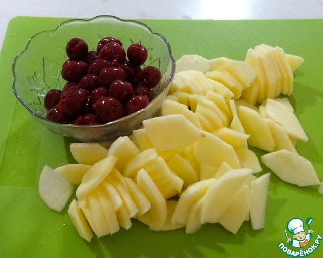 Очистить и порезать яблоки тонкими дольками. Вишню также подготовить избавившись от жидкости