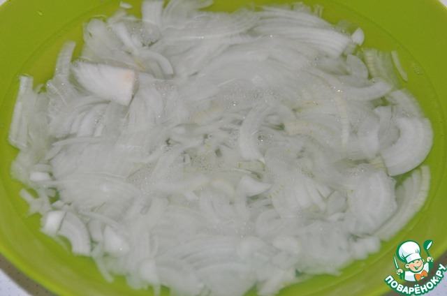 Репчатый лук нарезать полукольцами и, чтобы убрать горечь, залить кипятком. Дать постоять 2-3 минуты и отбросить на дуршлаг.