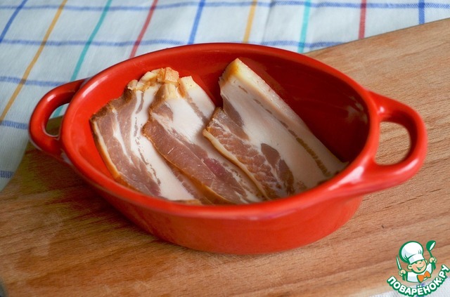 Порезать бекон пополам, выложить 3 шт. в смазанную оливковым маслом форму.