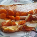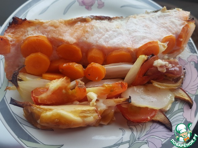 В подготовленную eмкость для выпекания выложить половину обжаренных овощей, порезанные кольцами или полукольцами помидоры и яблоки (яблоки лучше брать с кислинкой) и немного смазать майонезом, поперчить и посолить. Далее выложить разрезанное на порционные кусочки филе рыбы (с белой я не пробовала, но думаю, что будет неплохо, только надо брать не слишком жирную рыбу, ну например - сайда, треска) и тоже посолить, поперчить и смазать немного майонезом.