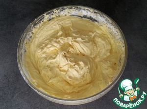 Готовим нижний слой: Взбиваем сахар с маслом комнатной температуры. Добавляем по одному желтки, продолжая взбивать массу.
