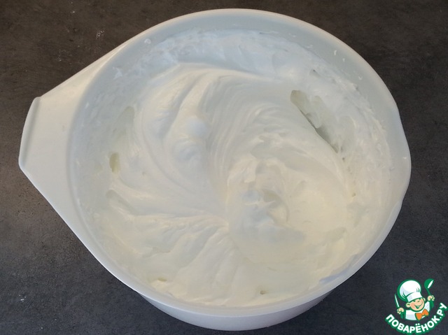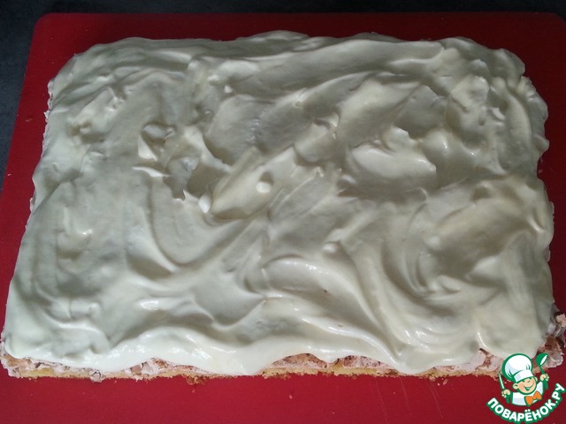 Появился и современный вариант: первый корж кладется меренгой вниз, наносится крем и все это дело накрывается вторым коржом меренгой вверх. Так меренга остается хрустящей, но мне не очень нравится внешний вид в таком случае.