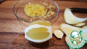 Снять цедру с лимона. Обрезать с лимона белую часть кожуры. Вынуть косточки и нарезать лимон тонкими ломтиками. У меня попался гипер кислый лимон и я полила ломтики лимона 1 ч. л. сиропа агавы.